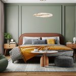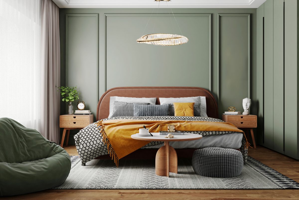 Bedroom interior in dark green style, 3d rendering