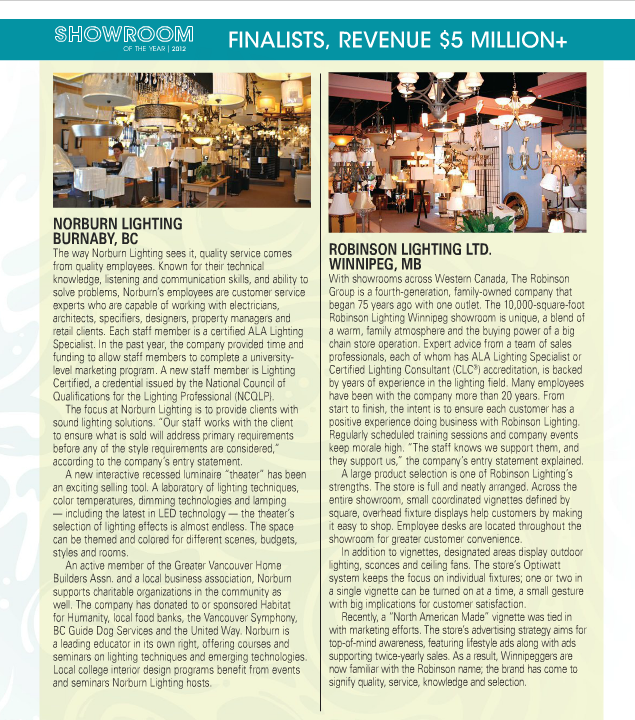Check out the latest issue of Residential Lighting Magazine for a look at all the Showroom of the Year Finalists. Norburn Lighting and Robinson Lighting featured on page 32.