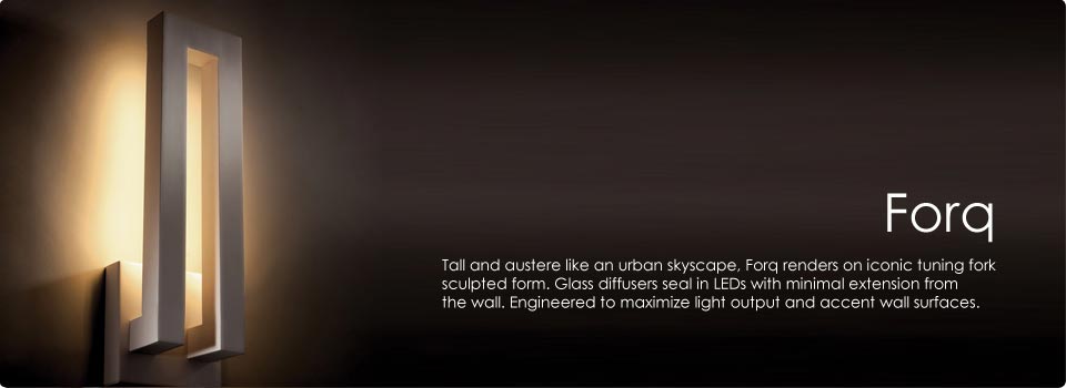 Designed for safe ambient lighting and architectural accenting, LED outdoor luminaires maximize light output and illuminate wall surfaces and pathways. Forq renders an industrial sculpted form with LEDs sealed in with glass diffusers. This contrasts with the cutting edge abstract design of Dawn that combines an indirect ambience with direct downlighting. Functional performance is also featured in the Tube design that converts 18 watts into nearly 900 fixture lumens.