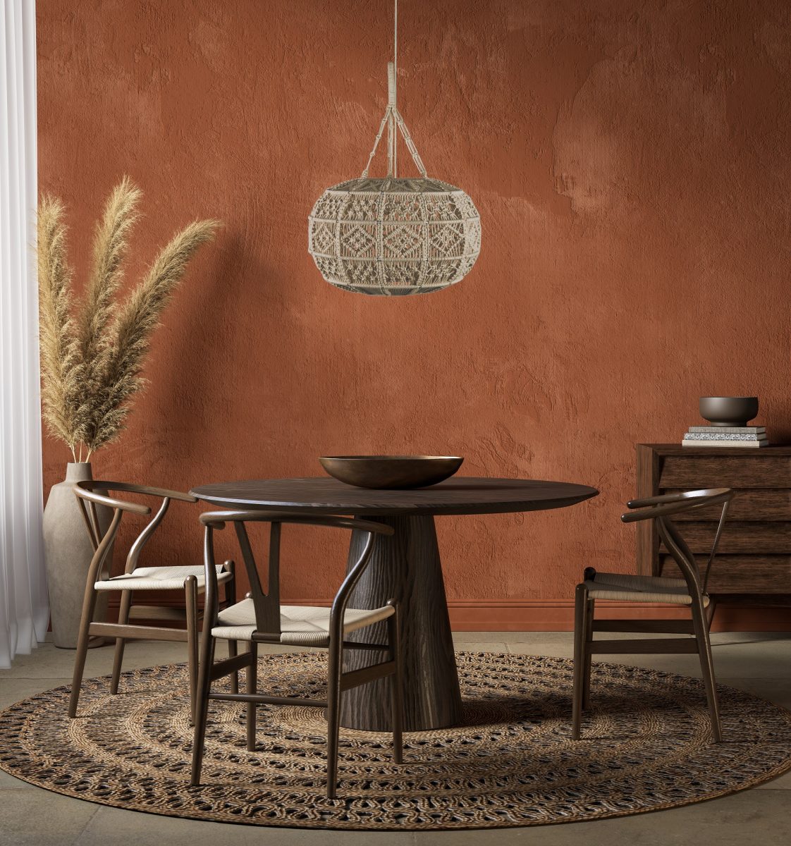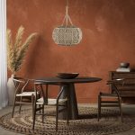 Orange interior with dining table and decor. 3d render illustration mockup.